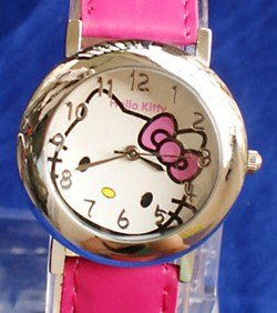 Childs Classic Hello Kitty Watch-Bezel is about the size of a Quarter Fits Children - teens and adults - Stainless Steel-Leather Strap-Three Hand Quartz Movement.This watch is in White